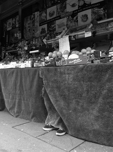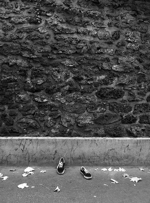 "La série de photographies proposée met en scène des chaussures dans un milieu urbain. Le vide, suggéré par le positionnement de ces dernières, doit amener le spectateur à intervenir mentalement dans le but d’imaginer – sur le support photographique – une personne, un animal, un objet, etc., portant ces baskets. Les photographies présentées deviennent alors un prétexte pour s’élever au-delà du visuel et nous guider vers un imaginaire, perpétuellement changeant."