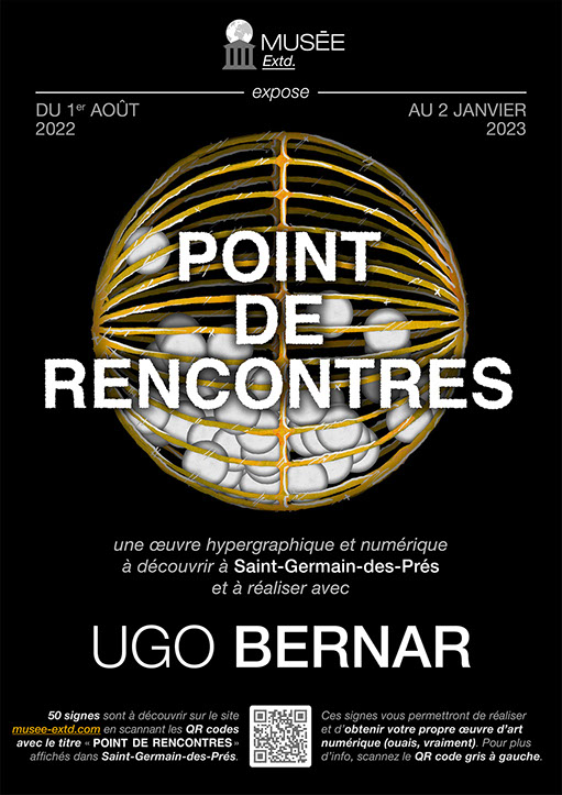 Cela étant dit, ces supports et techniques sont aussi employés de sorte à ce que les 50 éléments rencontrés s’agencent aléatoirement dans le but de créer une hypergraphie artistique, c’est-à-dire une œuvre d’art composée de signes issus de la transmission visuelle. En effet, à chaque rencontre avec un signe, tout individu découvrira aussi une même invitation sous forme de poème qui le conviera à effectuer les actions suivantes : 1) trouver d’autres signes dispersés dans un périmètre déterminé par l’artiste ; 2) noter le numéro qui a été attribué à chaque signe ; 3) envoyer par mail cette suite de numéros à l’artiste pour recevoir une hypergraphie artistique qui rassemblera aléatoirement tous les signes que l’individu a eu la chance de rencontrer. Dans la mesure où tout participant agit sans contrôle pour la réalisation d’une œuvre d’art hypergraphique, étant donné que la rencontre avec chaque signe est imprévisible, Point de rencontres doit être considéré comme un corpus d’œuvres hypergraphiques partiellement réalisées automatiquement par le public.