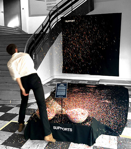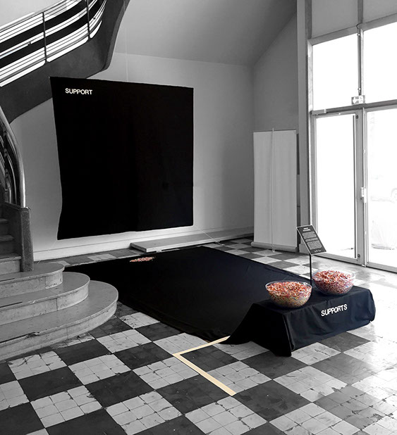 De cette réalisation anti-excoordiste et anti-hypertemporelle, on relève la présence de deux récipients, remplis de confettis multicolores, accompagnés du terme « SUPPORTS » non loin d’eux ; une surface noire sur laquelle est lisible le mot « SUPPORT » et sous laquelle se trouveront quelques confettis ; une ligne blanche qui doit se situer à plusieurs mètres de la surface noire ; et enfin, une invitation, formulée visuellement ou auditivement, pour orienter les agissements du public en faveur de la réalisation et des enjeux.